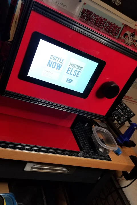 Apologies for the poor lighting! Right now these three units are about 90% complete. They are wired for 5v but not for mains. That means the Pi and screen are running but there is no power going to the grinder and heater.